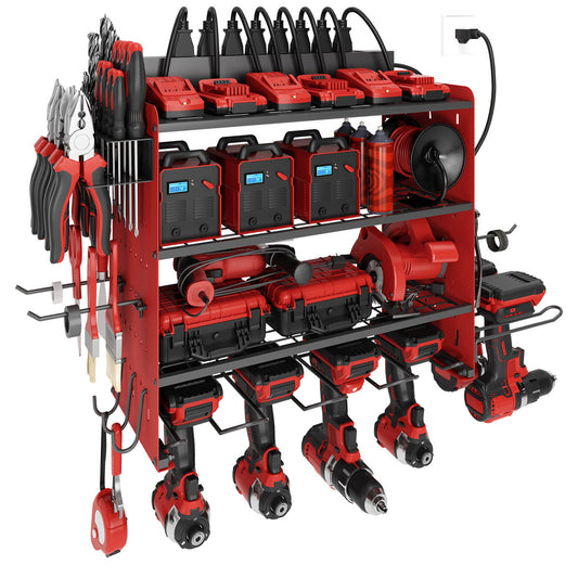 Modular Power Tool Organizer with Charging Station, Wall Mount Garage 4 Drill Shelf Rack